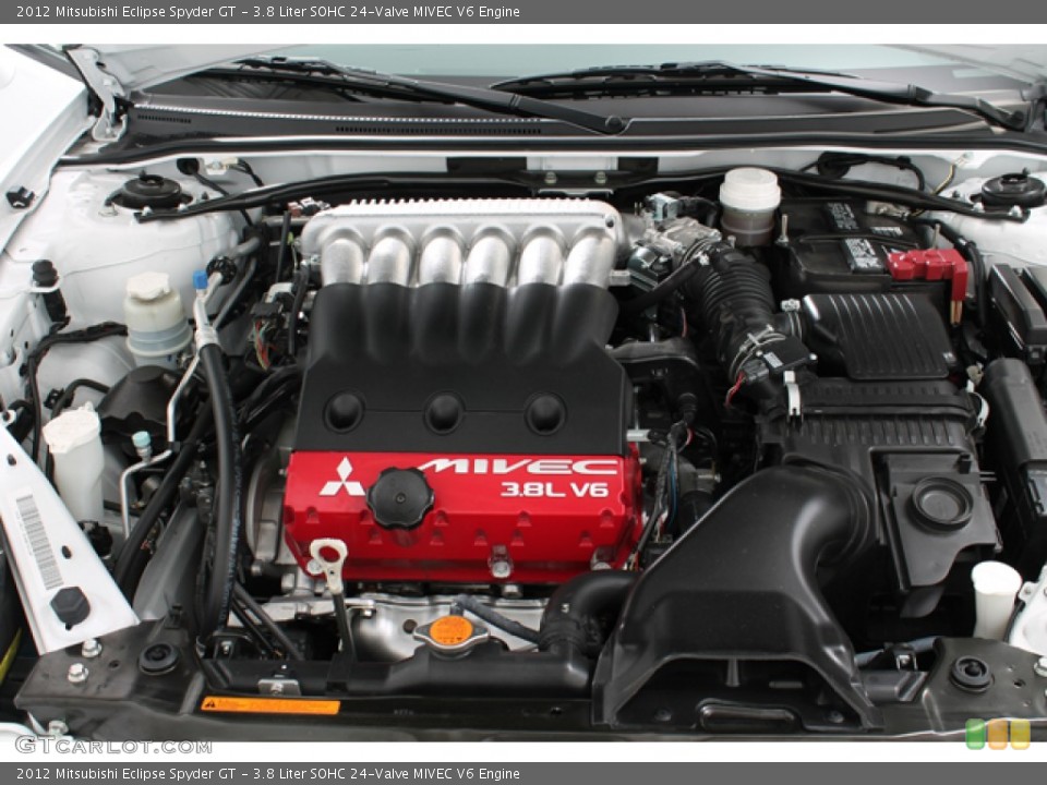 Eclipse coupes and convertibles are powered by one of two engines – a 162-horsepower 4-cylinder or a 265-horsepower V6. The V6 is only available in GT models and is linked to a 5-speed automatic transmission with manual shifting mode. The V6 requires premium gasoline, while the 4-cylinder engines can run on regular. Other than the 5-speed manual in the base version of the Eclipse coupe, the rest of the 4-cylinder models use an antiquated 4-speed automatic. All Eclipse models are front-wheel-drive.2012 Mitsubishi Eclipse GS, GS Sport, SE2.4-liter inline-4162 horsepower @ 6,000 rpm162 lb-ft of torque @ 4,000 rpmEPA city/highway fuel economy: 20/28 mpg (Coupe), 20/27 mpg (Spyder)2012 Mitsubishi Eclipse GT3.8-liter V6265 horsepower @ 5,750 rpm262 lb-ft of torque @ 4,500 rpmEPA city/highway fuel economy: 17/25 mpg (Coupe), 16/24 mpg (Spyder)