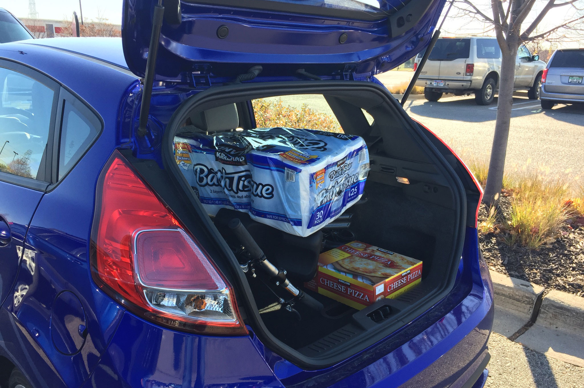 At 12.8 cubic feet, the sedan's trunk capacity is class-competitive. The Fiesta hatchback offers a bit less than that with its rear seat up. Unfortunately, the seats don't fold completely flat, and the Fiesta's 26 cubic feet of maximum cargo capacity is small even for this class of car.