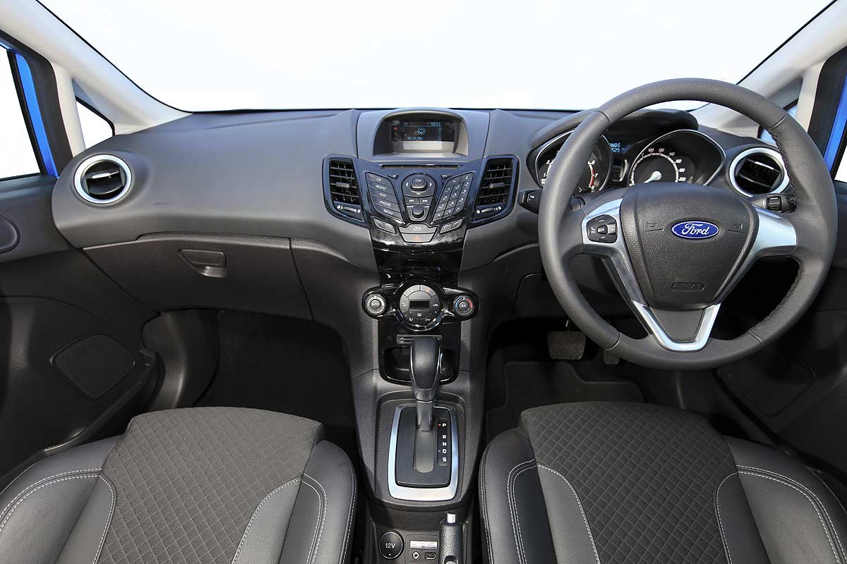 The Fiesta Titanium effectively comes with the contents of the SE Appearance and Comfort packages as standard, but wears a different set of 16-inch wheels, plus chrome exterior trim and a black grille. It also has a rearview camera, rear parking sensors, keyless ignition/entry, leather upholstery, upgraded Sony speakers, HD radio and an auto-dimming rearview mirror.