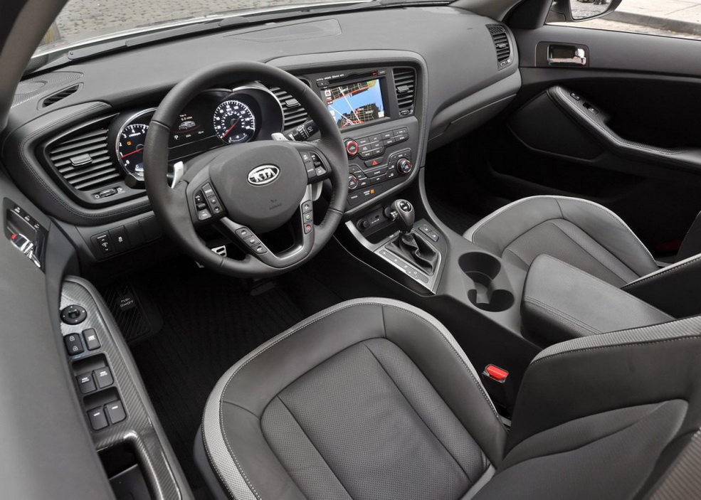 første indtryk af kia optimas interiør i 2012 er usædvanligt gunstige. hvor de fleste andre familiens sedans i dette segment falder et sted mellem beroligende og intetsigende, har optima en tydelig europæisk flair. og det skulle ikke komme som nogen overraskelse, når man tænker på, at kias chefdesigner tidligere arbejdede for audi. mens kia's interiør ikke er så overdådig som en audi's, er der en overflod af soft-touch materialer, og enhver hård plast er i det mindste godt struktureret. optima hybrids kabine er stort set den samme med en speciel gauge klynge, der viser hybrid effektflow og samlet kørestil effektivitet.