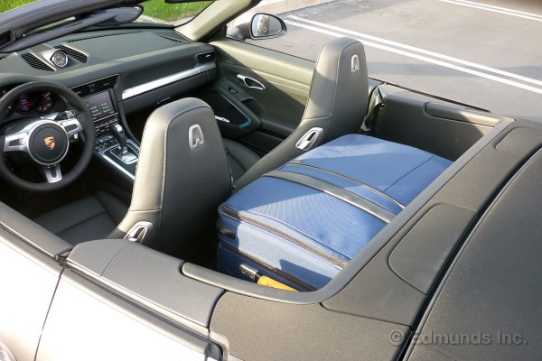 det nydesignede 911 interiøret har en midtkonsoll som feier oppover, og skaper en enhetlig bro mellom senterarmlenet og dashbordet som ligner på design porsche bruker til sin panamera sedan. oppsiden er at girskiftet er praktisk plassert nærmere rattet; Ulempen er at hytta føles mindre åpen og romslig enn før. den nye bilens lengre akselavstand oversettes også til ekstra benplass, men bare 1 tomme for forsetene. baksetene drar også fordel av ekstra benplass, men er fortsatt knapt egnet selv for små barn. realistisk, de nedfellbare seteryggene skaper en nyttig pakkehylle som er stor nok til å holde en golfbag.